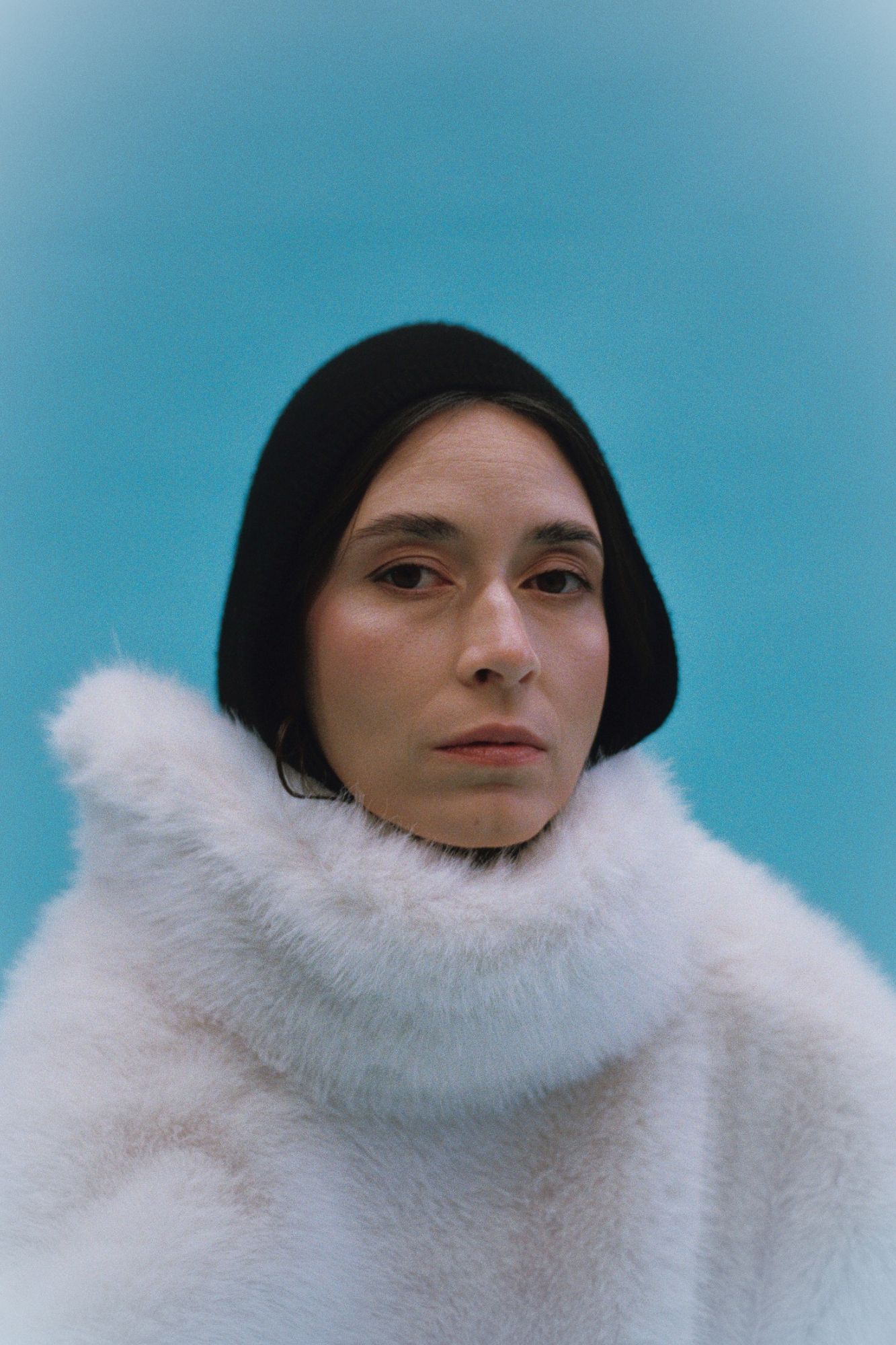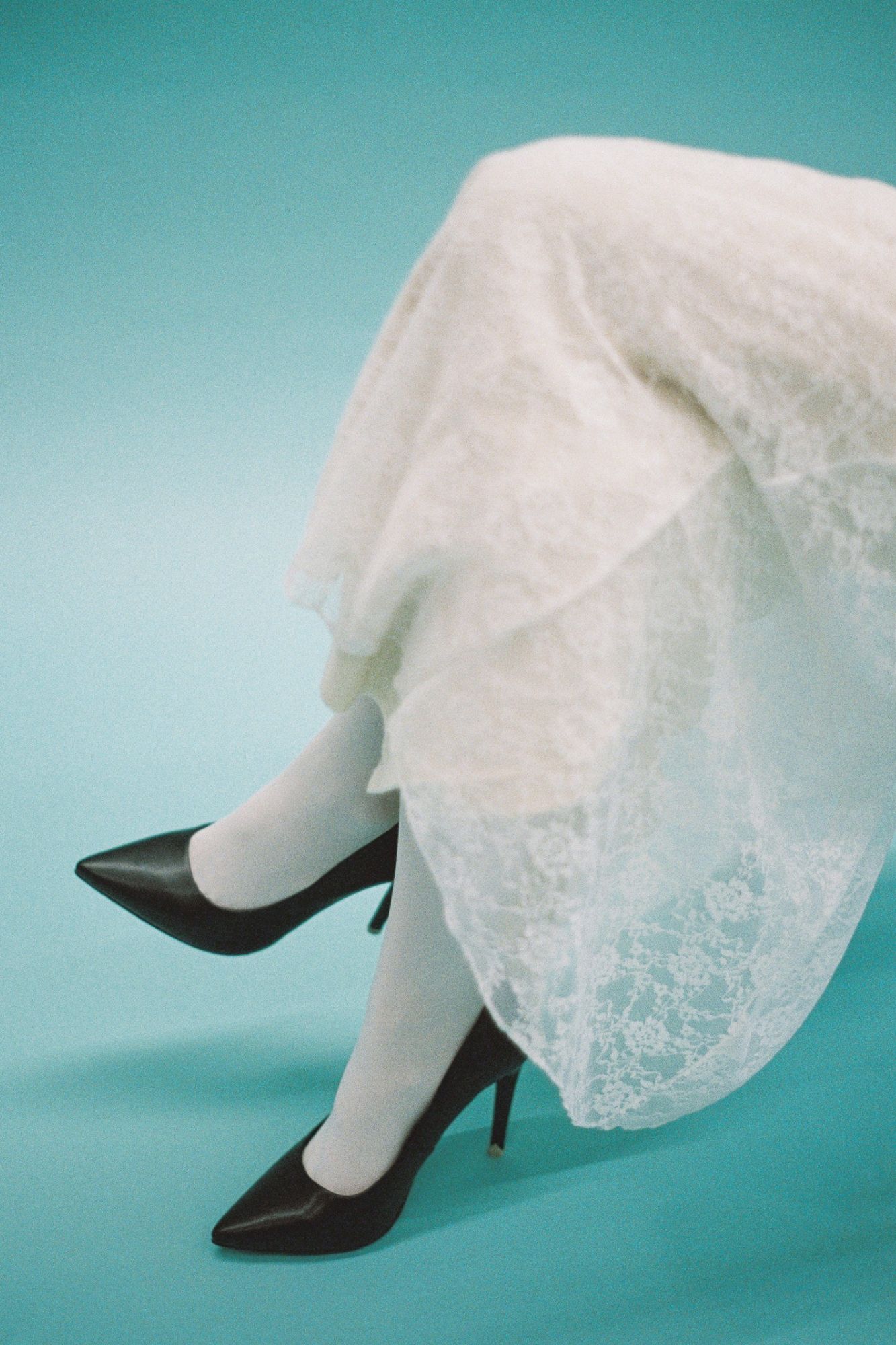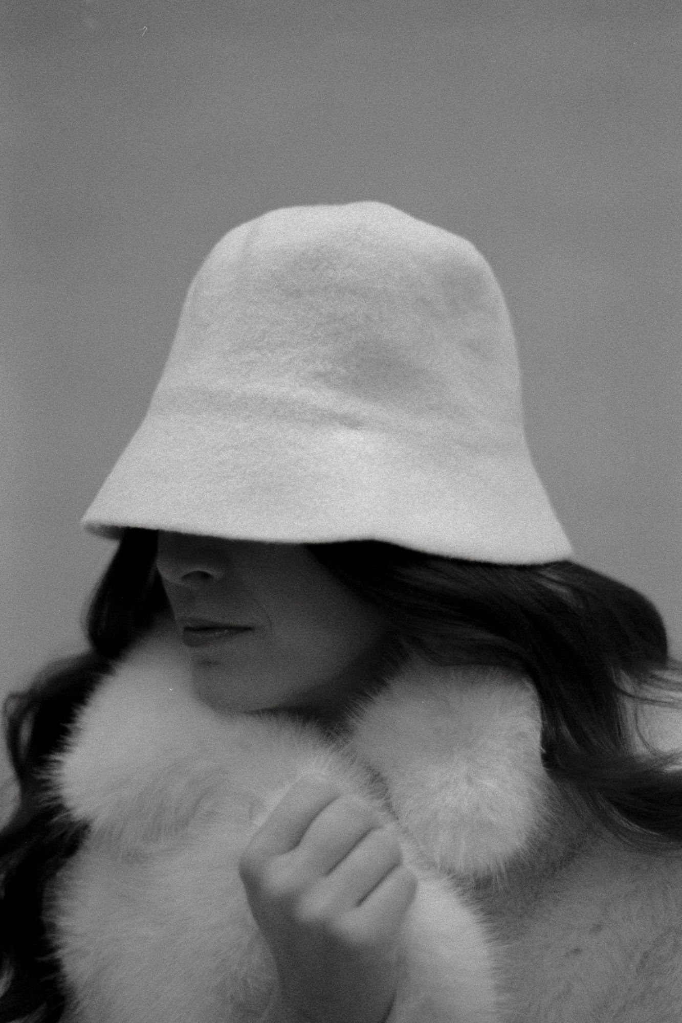 Ein Look zwischen Mystery und Minimalism – Kristin, Model & Content Creatorin, in einer Analog-Serie, die in FotoVogue und Icon Artist gefeatured wurde. Dunkles, sanftes gewelltes Haar trifft auf ein fast rohes, natürliches Make-Up – zurückhaltend aber intensiv. Der Kontrast: weißes Fake Fur, zarter Spitzenrock, weiße Strümpfe – pur, ästhetisch, unnahbar.